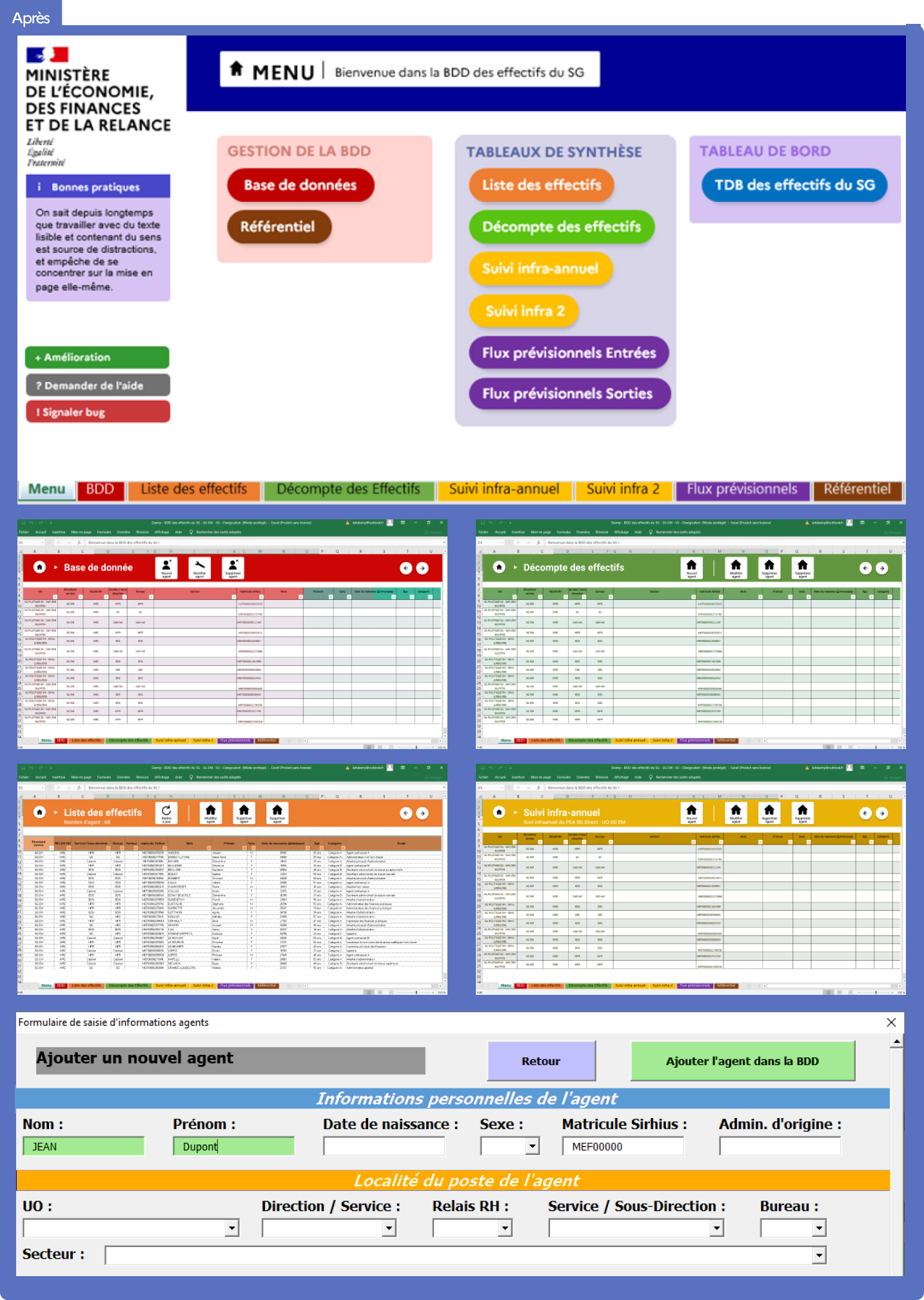 Grâce aux entretiens avec la cheffe de projet RH, nous avons créé un formulaire de saisie permettant d’uniformiser le format des champs, de contraindre leur saisie et d’appliquer les règles de gestion métier.